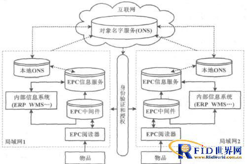 对象名字服务ONS(Objectsnameservice),类似于域名服务器,其中的信息可用于指向某个存放EPC中间件信息的服务器。EPC物联网系统结构如图2所示。