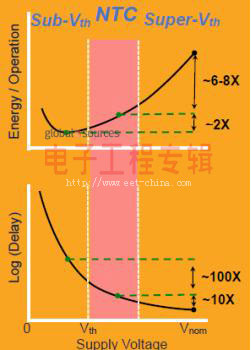 Muller指出,操作在亚阈值条件下,会牺牲性能并产生大量的功率增益,他接着将重点转向近阈值计算(NTC)技术,指出由于供应电压往往会等于晶体管的阈值电压,因此,与亚阈值条件相比,NTC可节省更多功耗,而且毋须牺牲性能。