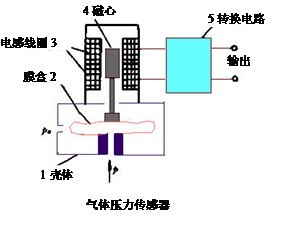 敏感元件是直接感受被测量,并输出与被测量成确定关系的某一物理量的元件。图3-1是一种气体压力传感器的示意图。膜盒的下半部与壳体固接,上半部通过连杆与磁心相连, 磁心置于两个电感线圈中,后者接入转换电路。这里的膜盒就是敏感元件,其外部与大气压力p0相通,内部感受被测压力p。当p变化时,引起膜盒上半部移动,即输出相应的位移量。